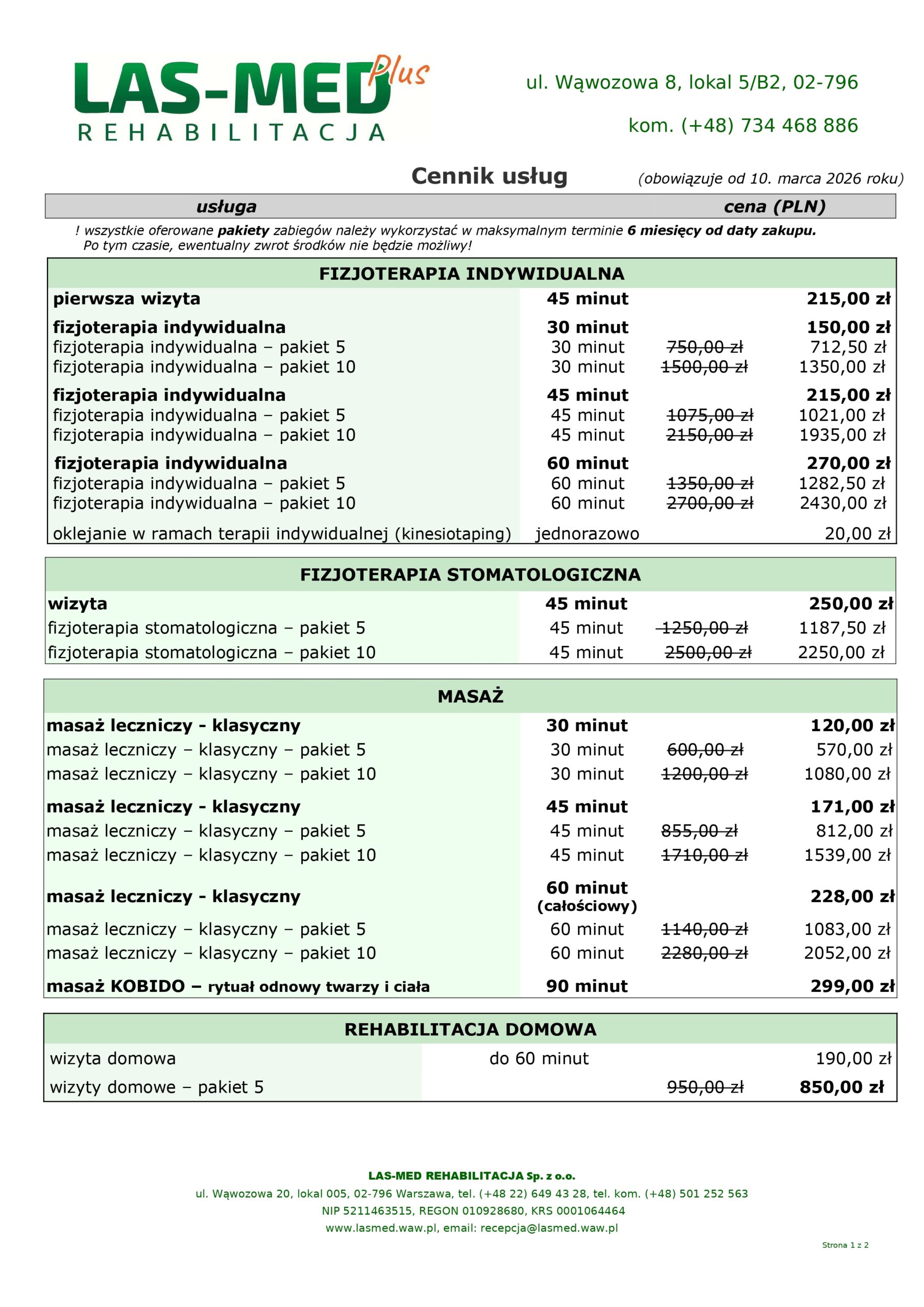 Chcesz zaplanować fizjoterapię czy masaż leczniczy na dłuższy czas? Nic prostszego – już teraz można wykupić pakiet 5 lub 10 wizyt fizjoterapii indywidualnej czy masażu (30-, 45-, 60-minutowego). W pakiecie TANIEJ – szczegóły w cenniku.